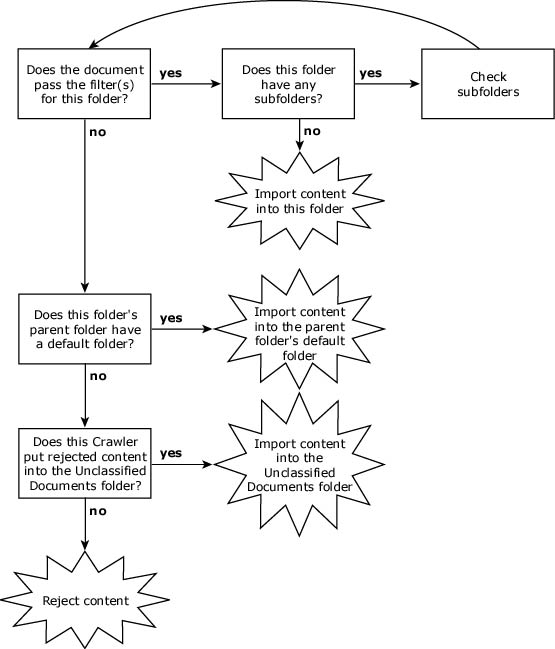 Nota: Si el documento no supera los filtros de la carpeta de destino, el crawler de contenido comprueba si la carpeta de destino tiene una carpeta por defecto. El crawler sólo comprueba si la carpeta principal tiene una carpeta por defecto en las subcarpetas de la carpeta de destino.